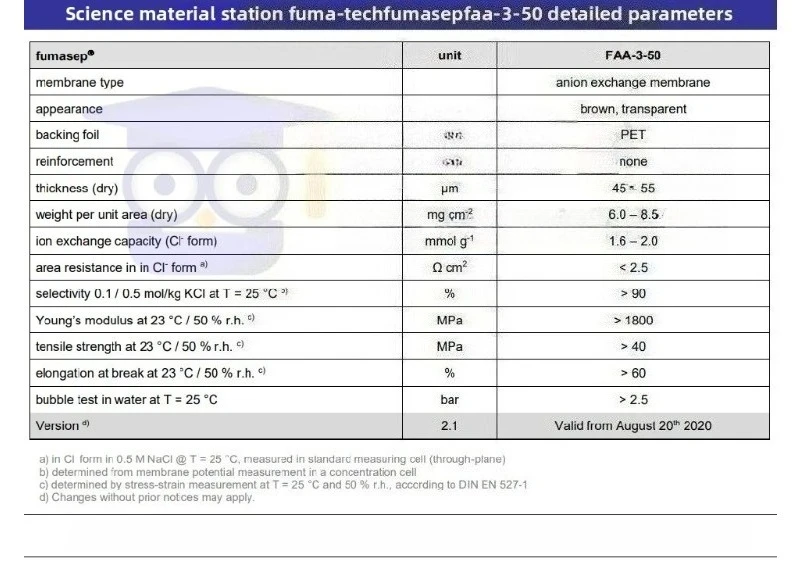 Parameter Comparison of FuMA-Tech FAA-3 Non-Reinforced Membrane Series in Scientific Materials Station