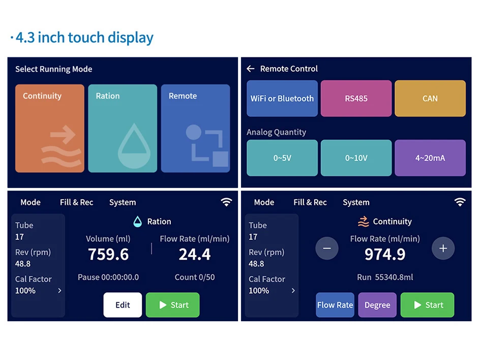 Suitable for filling occasions, the pump runs for a dosage, and then stops automatically, the user can manually trigger the start, you can also set the number of cycles, so that the pump runs cyclically; Select "Switch Mode" in the title bar to enter the mode selection interface, click "Ration" to enter the dispensing mode working interface;In the ration mode, there are two working modes, namely, semi-automatic working mode and full-automatic working mode;